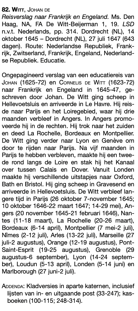 Het is ook mogelijk om de Grand Tour van de broers mee te lezen en op Google Maps te volgen. Dat kan hier. De twee bloemlezingen Johan de Witt en Engeland en Johan de Witt en Frankrijk, samengesteld door Ineke Huysman en Roosje Peters en geïllustreerd door Jean-Marc van Tol, lichten bijzondere passages in het journaal uit. Ten slotte heb ik een overzicht gemaakt van het kasboek van de broers, om beter te weten waar zij hun geld uitgaven. Een lemma over het journaal staat in mijn proefschrift.